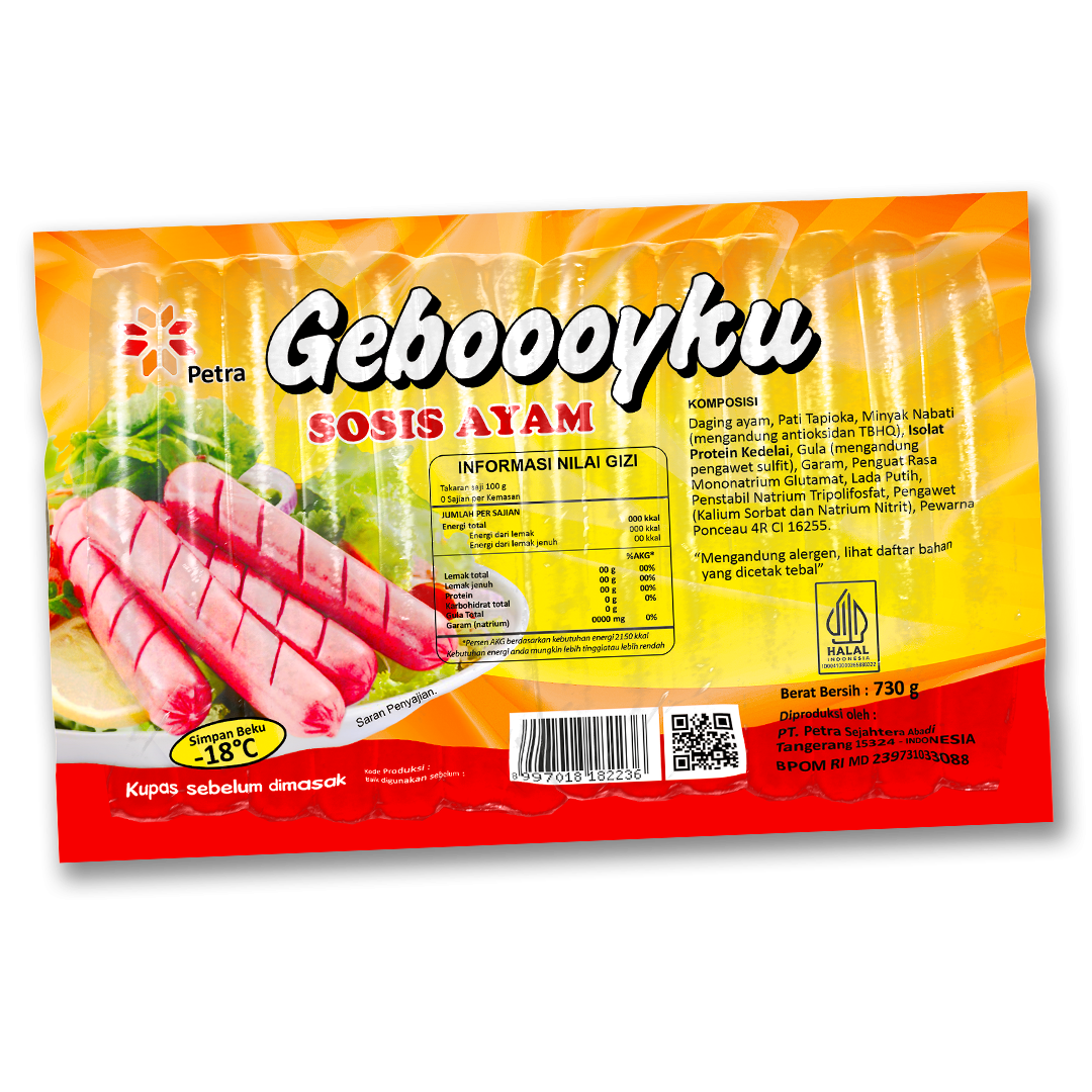 Daging Ayam (66.847%), Pati Tapioka, Minyak Nabati (Mengandung Antioksidan TBHQ), Isolat Protein Kedelai, Gula (Mengandung Pengawet Sulfit), Garam, Penguat Rasa Monosodium Glutamat, Lada Putih, Penstabil Fosfat, Pengawet (Kalium Sorbat dan Natrium Nitrit), Pewarna Sintetik Ponceau 4R CI. No. 16255