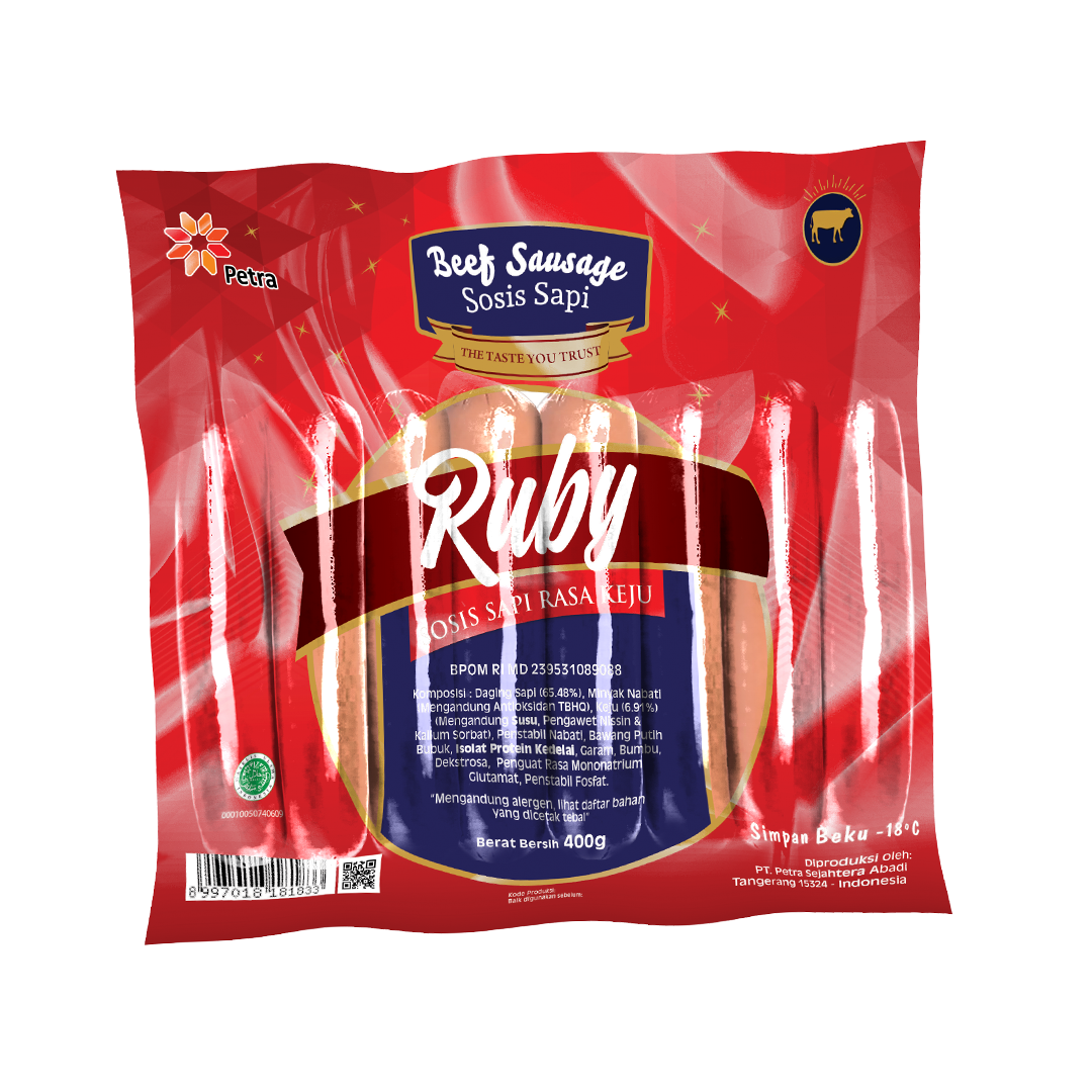 Bratwurst adalah salah satu sosis khas Jerman yang terkenal kelezatannya, karena Pada umumnya jenis sosis ini menggunakan daging sapi muda. RUBY BRATWRUST SAPI dan AYAM merupakan sosis premium dengan tekstur european, perpaduan daging sapi dan ayam pilihan yang di cincang halus dengan tambahan extra keju dan dikukus dengan menggunakan casing collagen yang dapat di komsumsi. Bratwurst disajikan dengan cara dipanggang atau digoreng